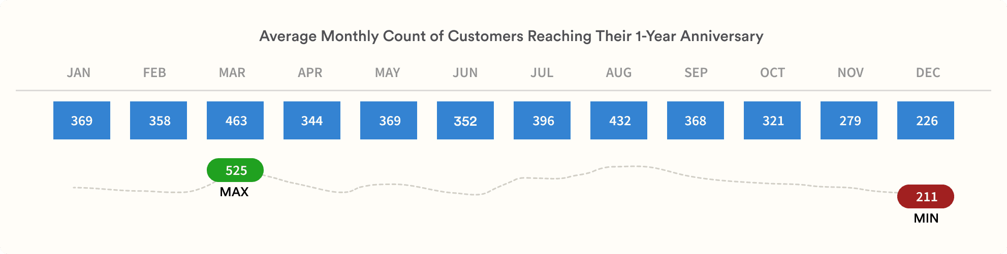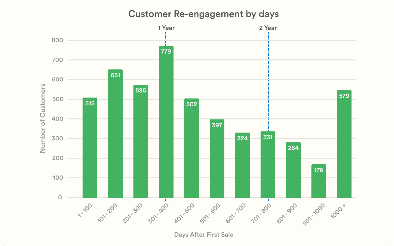 Before building the campaign, I examined 35 years of historical customer data to understand post-purchase behavior. I tracked each customer’s first sale, identified their most recent activity after that sale, and measured how frequently they engaged afterward. This allowed me to pinpoint the most effective timing for re-engagement. The analysis revealed that repeat purchases most frequently happened 12 months after the initial sale. I also found that the average customer made two purchases over their lifetime, with a maximum of four.